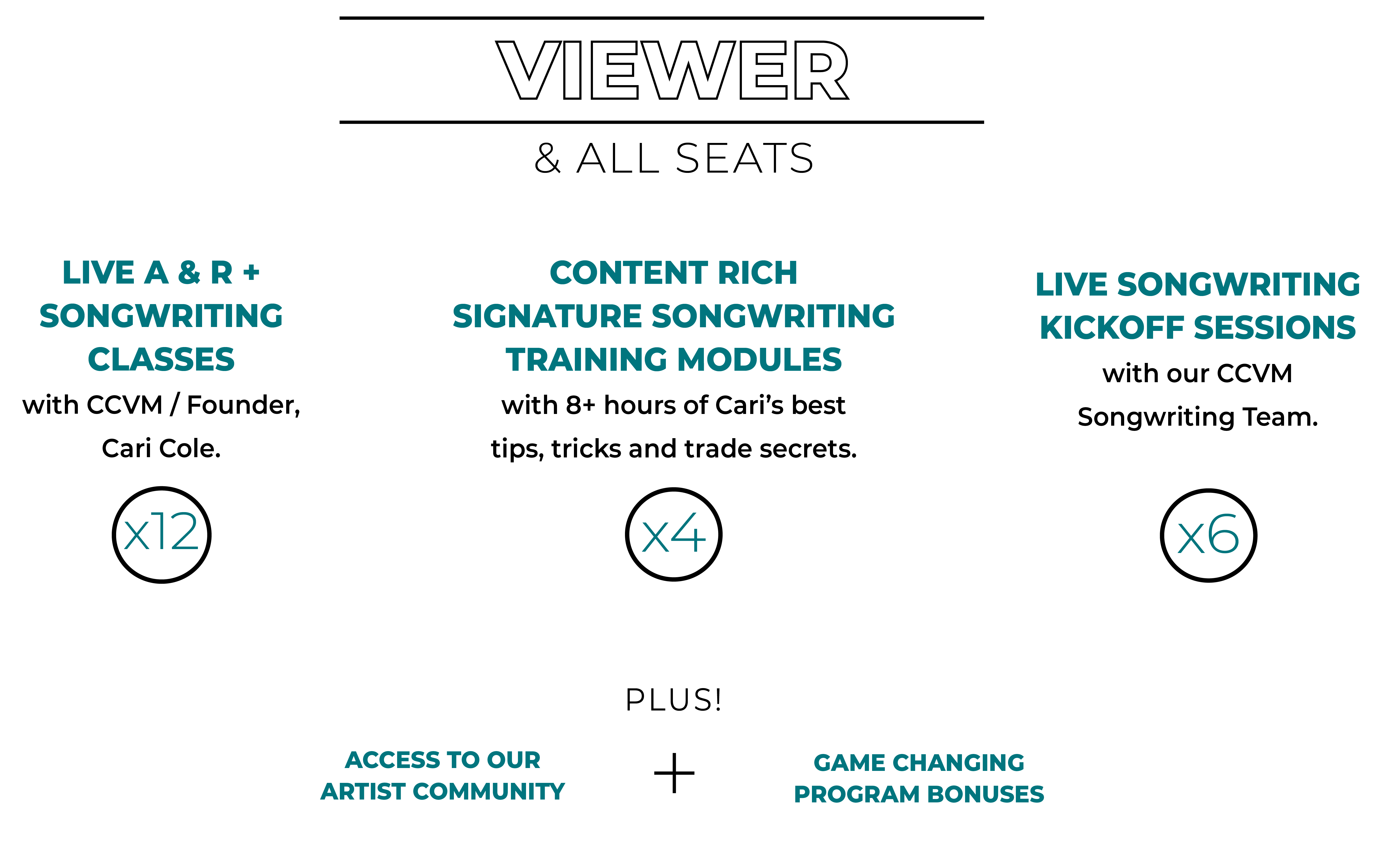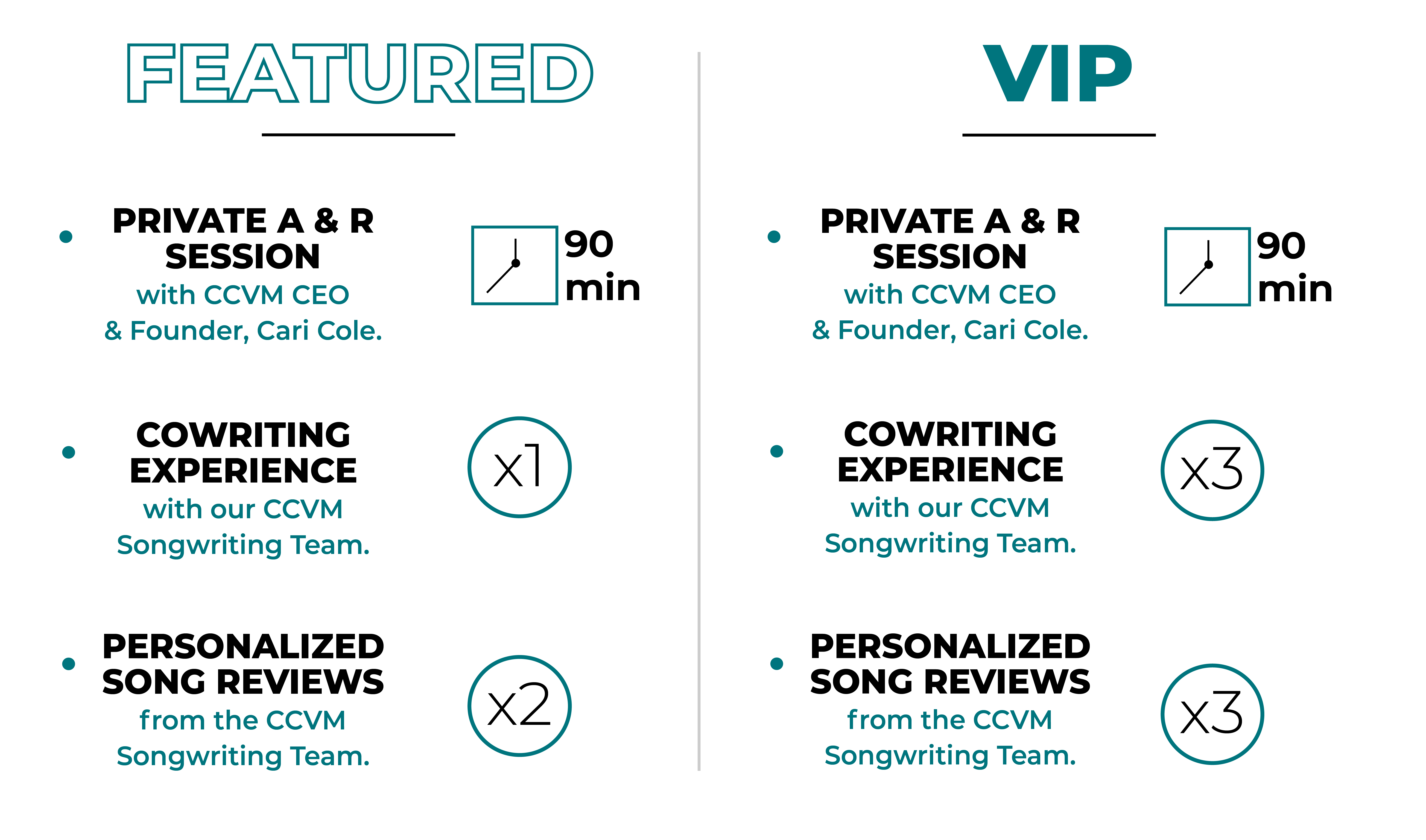You will be given the opportunity to work privately with CCVM CEO / Founder, Cari Cole, for guided A & R Direction, followed by a Private Cowriting Experience with our Award Winning CCVM Songwriting Team. All private sessions are held online via zoom conferencing. *Exclusive to select seats.