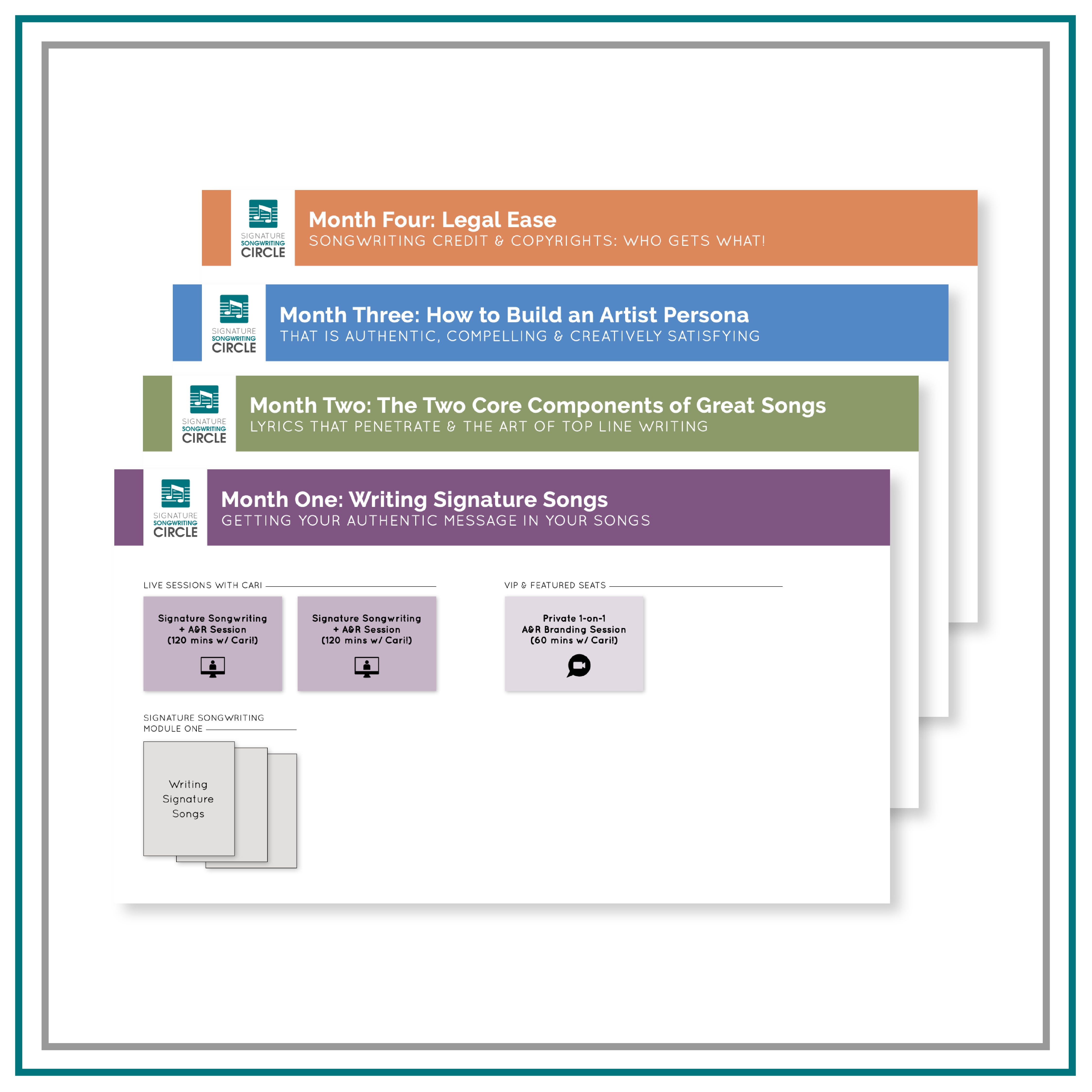 The only songwriting program created specifically for artists to find their message, sound and direction. After 3 decades of writing with independent artists, and seeing similar issues arise, Cari designed this program to provide a high-level of A & R Direction, usually only available to signed artists. In SSC we explore your influences, musical direction, message, artist persona, song concepts, and vision. Through directed cowrites with industry level chart topping songwriters, we craft songs that reflect your voice and musical vision. Walk away with a stunning collection of songs that you not only love but is pre-qualified by industry leaders themselves.